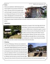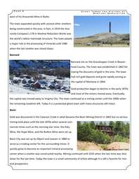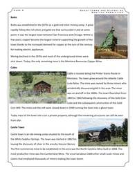 P a g e 2 G h o s t T o w n s a n d H i s t o r y o f M o n t a n a N e w s l e t t e r west of his Anaconda Mine in Butte. The town expanded quickly with several other smelters being constructed in the area. In fact, in 1919 the Anaconda Company’s 178 m Washoe Reduction Works was the world’s tallest manmade structure. The town played a major role in the processing of minerals until 1980 when the last smelter was closed down. Bannack Photo by Jolene Ewert-Hintz Photo by Jolene Ewert-Hintz Bannack sits on the Grasshopper Creek in Beaverhead County. The town was established in 1862 following the discovery of gold in the area. The town had rich gold deposits and grew rapidly serving as the capital of Montana in 1864. Gold production began to decline in the early 1870s and most of the miners moved away. Eventually, the capital was moved away to Virginia City. The town continued as a mining center until the 1900s when the remaining residents left. Today it is a protected ghost town with many structures still intact. Basin Gold was discovered in the Cataract Creek in what became the Basin Mining District in 1862 but no serious mining took place until the late 1870s when several commercial mines such as the morning star mine, the Katy Mine, the Hope Mine, and the Bullion Mine were set up. Basin City was set up by Allport and Lawson in 1880 to serve as a trading center for the surrounding mines. It quickly grew to become an important mineral processing center when a smelter was constructed nearby. Mining continued until 1925 when the last mine was shut down for the last time. Today the town is a small community of artists although it is still a favorite for mineral prospectors. Photo by Jolene Ewert-Hintz P a g e 3 G h o s t T o w n s a n d H i s t o r y o f M o n t a n a N e w s l e t t e r Butte Butte was established in the 1870s as a gold and silver mining camp. It grew rapidly follow the rich silver and gold ore that surrounded it and at some point, it was the largest town between San Francisco and Chicago. Within a few years, copper became the largest mineral supporting the growth of the town thanks to the increased demand for copper at the turn of the century for making electric appliances. Mining declined in the 1970s and most of the underground mines were shut down. Today, the only remaining mine is the Montana Resources Copper Mine. Cable Photo by Jolene Ewert-Hintz Photo by Jolene Ewert-Hintz Cable is located along the Pintler Scenic Route in Montana. The town grew around the Atlantic Cable Lode Mine. The mine was owned by three miners who accidentally discovered gold in the area. The mine was on and off in the 1800s. The town flourished from 1890 to 1940 following the discovery of the Gold Coin Lode and the subsequent construction of the Gold Coin Mill. The mine and the mill were closed down in 1940 turning the town into a ghost town. Today most of the town site is on a private property although the remaining structures can still be seen from afar. Castle Town Castle town is an old mining camp situated to the south of the White Sulphur Springs. The town was started in 1882 following the discovery of silver in the area by Hanson Barnes. The first commercial mine to be established in the area was the North Caroline Mine built in 1884. The most productive mine was the Cumberland Mine. The area had about 1000 other small-scale mines and claims that employed thousands of miners making the town boom. Photo by Jolene Ewert-Hintz