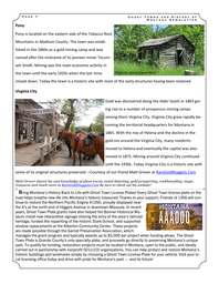 P a g e 6 Helena Helena was established in 1864 following the discovery of gold on the Last Chance Gulch by four miners. The news of the rich ore sparked a gold rush that brought in thousands of miners setting up a mining camp that grew into the modern day, Helena. Although gold ore eventually dried up, Helena had become the Territorial capital in 1875 and had great transport networks and links to all major mining towns in the area and therefore did not decline. Independence G h o s t T o w n s a n d H i s t o r y o f M o n t a n a N e w s l e t t e r Photo by Jolene Ewert-Hintz Photo by Jolene Ewert-Hintz Independence is located in Park County high within the Absaroka Range. The town was set up around the Independence mine in 1889 and was an important supplier to several other mines in the area such as the King Solomon Mine, the Daisy Mine, the Poorman Mine and the Hidden Treasure mine among others. Mining in the town came to an end in the early 1900s and although efforts to revive the mining were underway for a number of years they were not profitable. Today only a few run down structures remain at the site of the town. Philipsburg The town of Philipsburg in Montana was established in 1867. The town developed around the Hope Mill and was named after Philipp Deidesheimer who was responsible for the construction of the mill. Mining in the area attracted thousands of miners who lived in the town but the majority was employees of the St. Louis and Montana Mining Company which had a number of mines and claims nearby. Mining in the area came to an end in the early 1900s. Today only a few remnants of the early mines remain but the town is far from becoming a ghost town. Photo by Jolene Ewert-Hintz P a g e 7 G h o s t T o w n s a n d H i s t o r y o f M o n t a n a N e w s l e t t e r Pony Pony is located on the eastern side of the Tobacco Root Mountains in Madison County. The town was established in the 1860s as a gold mining camp and was named after the nickname of its pioneer miner Tecumseh Smith. Mining was the main economic activity in the town until the early 1920s when the last mine closed down. Today the town is a historic site with most of the early structures having been restored. Virginia City Photo by Jolene Ewert-Hintz Photo by Jolene Ewert-Hintz Gold was discovered along the Alder Gulch in 1863 giving rise to a number of prosperous mining camps among them Virginia City. Virginia City grew rapidly becoming the territorial headquarters for Montana in 1865. With the rise of Helena and the decline in the gold ore around the Virginia City, many residents moved to Helena and eventually the capital was also moved in 1875. Mining around Virginia City continued until the 1930s. Today Virginia City is a historic site with some of its original structures preserved. –Courtesy of our friend Matt Grover at RareGoldNuggets.Com Matt Grover shares his vast knowledge of ghost towns, metal detecting, gold prospecting, rockhounding, maps, treasures and much more at RareGoldNuggets.Com Be sure to check out his website! Bring Montana’s History Back to Life with Ghost Town License Plates! Every Ghost Town license plate on the road helps breathe new life into Montana’s historic treasures! Thanks to your support, Friends of 1356 will continue to restore the Northern Pacific Engine #1356, proudly displayed near the X’s at the north end of Higgins Avenue in downtown Missoula. In recent years, Ghost Town Plate grants have also helped the Bonner Historical Museum install new interpretive signage sharing the story of the area’s railroad heritage, funded the repainting of the historic Stark School, and supported window replacements at the Alberton Community Center. These projects are made possible through the Garnet Preservation Association, which manages the grant program and typically awards up to $5,000 per project when funding allows. The Ghost Town Plate is Granite County’s only specialty plate, and proceeds go directly to preserving Montana’s unique past. To qualify for funding, restoration projects must be located in Montana, open to the public, and ideally carried out in partnership with nonprofit 501(c)(3) organizations. You can help protect and restore Montana’s historic buildings and landmarks simply by choosing a Ghost Town License Plate for your vehicle. Visit your local licensing office today and drive with pride for Montana’s past — and its future!