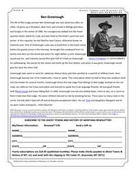 P a g e 8 G h o s t T o w n s a n d H i s t o r y o f M o n t a n a N e w s l e t t e r Ben Greenough The life of Red Lodge pioneer Ben Greenough was one adventure after another. He grew up in Brooklyn, New York, and arrived in Billings penniless and hungry in the winter of 1886. He courageously walked into the Headquarters Hotel, asked for a job, and was hired as the hotel’s yard man and porter. In this capacity, he met Martha Jane Canary, otherwise known as Calamity Jane. One of Greenough’s jobs was to build fires in the hotel rooms before the guests arose in the morning. He bought the cordwood from Calamity Jane who cut the wood and sold it for eight dollars a cord. Greenough would pay her, and Calamity would then give half of it back to Greenough for safekeeping. She would hit the saloon and drink up the four dollars, and when it was gone, Greenough would give her back the other half. Greenough later went to work for cattleman Nelson Story and then worked at a sawmill on Willow Creek. Here Greenough learned one of his trademarks—how to swear. This came about when he had to drive two stubborn bulls into the timber for several months. Greenough drove the mail stage from Billings to Red Lodge, worked on the railroad, ran cattle on the Crow reservation and learned to speak the Crow language fluently. He was good friends with Plenty Coups and knew Sitting Bull. In 1900, Greenough married and settled down, more or less, on a ranch on Rock Creek near Red Lodge. His seven children learned to ride by breaking horses. There were so many rocks in the corral, the kids didn’t dare fall off and all became exceptional riders. His son Turk and daughters Margaret and Alice were rodeo champions. –Ellen Baumler Library of Congress, LC-USF34-058658-E Ellen Baumler was an award-winning author and Montana historian. A master at linking history with modern-day supernatural events, Ellen's true stories have delighted audiences across the state. The legacy she left behind will be felt for generations to come and we are in debt to her for sharing her extensive knowledge of Montana history in such an entertaining manner. To view and purchase Ellen’s books, visit: http:// ellenbaumler.blogspot.com/p/my-books.html My/Donor Information: SUBSCRIBE TO THE GHOST TOWNS AND HISTORY OF MONTANA NEWSLETTER! Renewal? Y/N Send a Gift to: NAME____________________________________ NAME___________________________________ ADDRESS__________________________________ ADDRESS_________________________________ CITY______________________________________ CITY_____________________________________ STATE__________________ZIP________________STATE_________________ ZIP________________ Yearly subscriptions are $19.95 (published monthly). Please make checks payable to Ghost Towns & History of MT, LLC and send with this clipping to 701 Cedar ST, Anaconda, MT 59711 ©2025 Ghost Towns and History of Montana, LLC. All rights reserved.