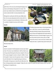 P a g e 4 G h o s t T o w n s a n d H i s t o r y o f M o n t a n a N e w s l e t t e r The silver panic of 1893 and the subsequent drop in silver prices forced most of the mines to be closed and the miners left town. Today the town is a ghost town with a number of original structures still standing. Photo by Jolene Ewert-Hintz Comet The town grew around the Comet Mine developed by the Helena and Livingstone Smelting and Reduction Company. The mines were operational until 1897 when it closed and was later sold to the Montana Consolidation Copper Company before being handed over to the Basin Montana Tunnel Company in 1927. The Mine was one of the most productive mines in the state. It closed down for the last time in 1941. Slowly the town became a ghost town and today just a couple of the structures still remain. Elkhorn Elkhorn is an old mining camp located within the Elkhorn Mountains. Silver was first discovered at the site of the town in 1870 by Peter Wys a Swiss immigrant. He died shortly thereafter and Antony M Holter took over his claim and developed the Holter Lode Mine. This brought in a lot of miners who laid several other mines such as the Hard Cash Mine, the Union Mine, the C&D Mine and the Golden Curry Mine among others and also established Elkhorn. In 1880 the Elkhorn Mining Company took over the Holter Lode Mine and transformed it building a 10 stamp mill and a smelter for the mine. Mining continued in the town until the early 1900s when most of the mining stopped. The Elkhorn Mine was on and off from then until 1937 when it closed down for the last time. Garnet Garnet is located in the Granite County along the Garnet Range Road in Western Montana. Gold was first discovered along the nearby First Chance Gulch in the 1860s. Later the Garnet Lode, one of the richest Photo by Jolene Ewert-Hintz P a g e 5 G h o s t T o w n s a n d H i s t o r y o f M o n t a n a N e w s l e t t e r gold mines in the area was developed bringing more miners and leading to the growth of a town. The town was initially known as Mitchell but changed the name to Garnet after its most productive mine. Mining here continued until the early 1900s when the rich ore was exhausted and the miners left. Today it is a popular tourist attraction in Montana with a number of original structures still in place. Granite Photo by Jolene Ewert-Hintz Montana State Park. Hassel Hassel is located in the Broadwater County near Indian Creek. The town was established in 1875 as Saint Louis mining camp following the discovery of gold in the area. The camp changed its name to Hassel in 1895 in honor of Joseph E. Hassel one of its pioneer miners. It thrived until 1910 when the rich gold bearing ore dried up. Thereafter mining was on and off until 1946 when the last mining operations were stopped. Today the site is under the Apollo Mining Company which has been working on mining the area. Photo by Jolene Ewert-Hintz Eli Holland discovered silver in the Granite Mountain in 1875. But, it was not until the Granite Mountain Mining Company discovered the Bonanza Chute and established the Granite Mine in 1880 that the town of Granite began to grow. The town flourished until the silver panic of 1893 forced the mines to close and many residents left. Today the town is a ghost town preserved by the Photo by Jolene Ewert-Hintz